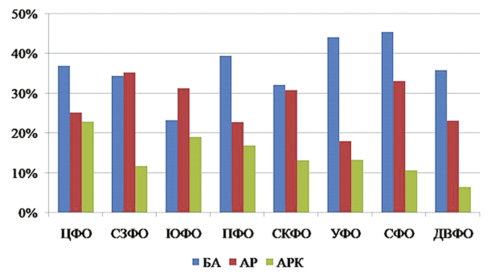 Note. ЦФО – Central Federal District; СЗФО – Northwestern Federal District; ЮФО – Southern Federal District; ПФО – Volga Federal District; СКФО – North Caucasian Federal District; УФО – Ural Federal District; СФО – Siberian Federal District; ДВФО – Far Eastern Federal District.