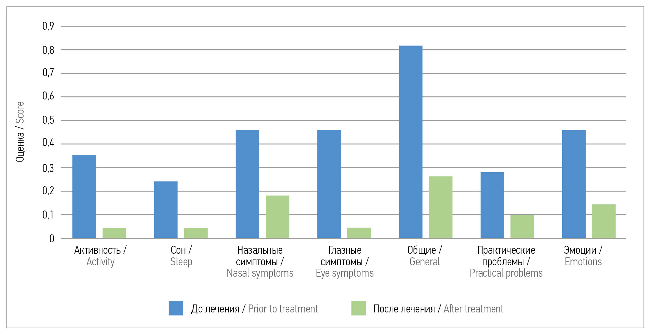 Для оценки качества жизни использовали разработанный в 1993 г. опросник Rhinoconjunctivitis Quality of Life Questionnaire (RQLQ). Результаты опросника оценивали по доменам: ограничение активности — 0,9; сон — 0,6; назальные симптомы — 0,46; глазные симптомы — 0,46; общие симптомы — 0,82; практические проблемы — 0,28; эмоциональная функция — 0,46.
