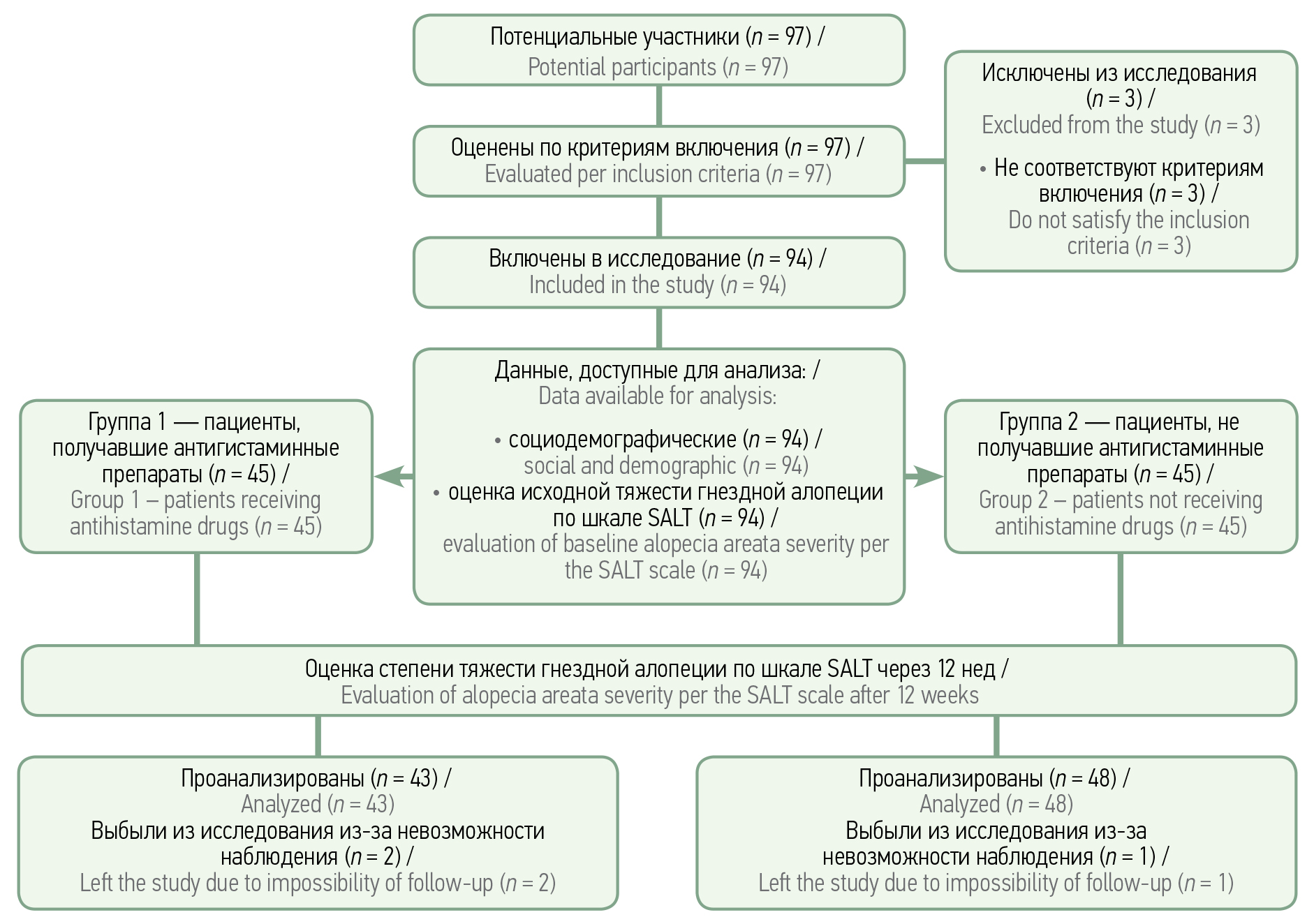 Критерии включения: наличие установленного диагноза ГА (код МКБ-10: L63.2; L63.8), которая на период исследования имела легкую или умеренную степень тяжести согласно шкале SALT (severity of alopecia tool) — <25 % площади потери волос на голове; наличие аллергических заболеваний — аллергического ринита/риноконъюнктивита, бронхиальной астмы, атопического дерматита (код МКБ-10: J30.1; J30.2; J30.3, J30.4; J45.0; J45.8; H10.1; L20.8); возраст 12 лет и старше; добровольное участие в исследовании и подписанное информированное согласие.