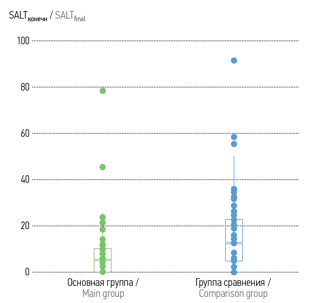 В конце периода наблюдения медиана SALT в основной группе составила 5,4 % (IQR 9,35 %), что свидетельствует о значительном снижении показателей ГА по сравнению с исходными значениями. В группе сравнения медиана SALT осталась существенно выше — 12,65 % (IQR 18,65 %). Значительно меньший разброс данных вокруг медианы в основной группе, чем в группе сравнения, указывает на более однородный ответ на терапию, включающую АГП. Статистически значимые различия в конечных значениях индекса SALT (p = 0,002) между 2 группами могут указывать на возможность влияния АГП на исход лечения или течение ГА (рис. 2).