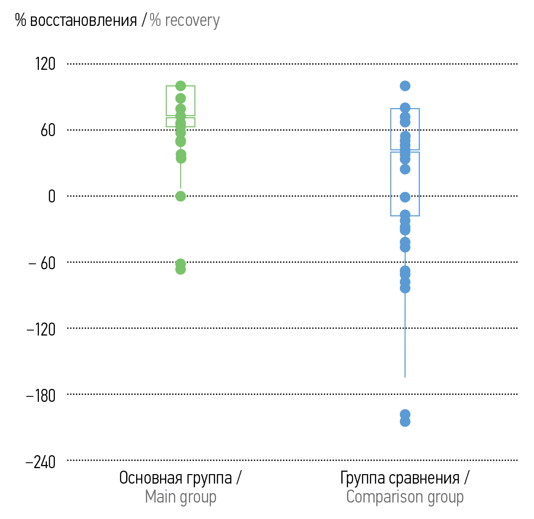 При анализе показателей восстановления волос (процент возобновления роста волос) в обеих группах отмечены разнонаправленные изменения. Медиана показателя восстановления волос в основной группе составила 72,04 % (IQR 35,73 %), тогда как в группе сравнения — 40,97 % (IQR 93,32 %); различия между группами были статистически значимы (p = 0,001). В основной группе отрицательная динамика в виде прогрессирования потери волос, несмотря на лечение, отмечалась у 2/43 (4,65 %) пациентов; в группе сравнения число пациентов с увеличением конечного показателя SALT и отрицательными значениями процента восстановления волос было значительно больше и составило 15/48 (31,25 %). Показатели (%) восстановления волос в группах представлены на рис. 3.