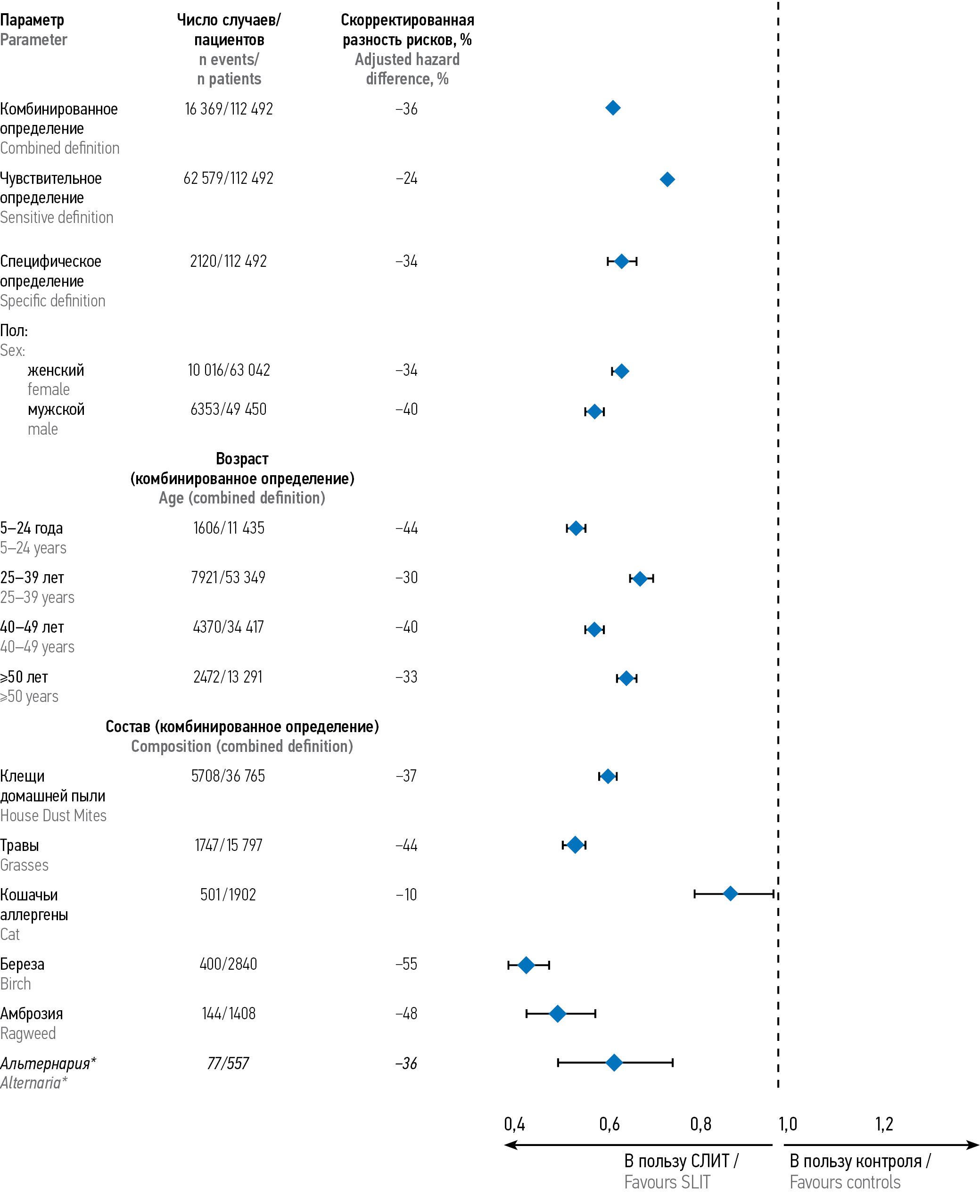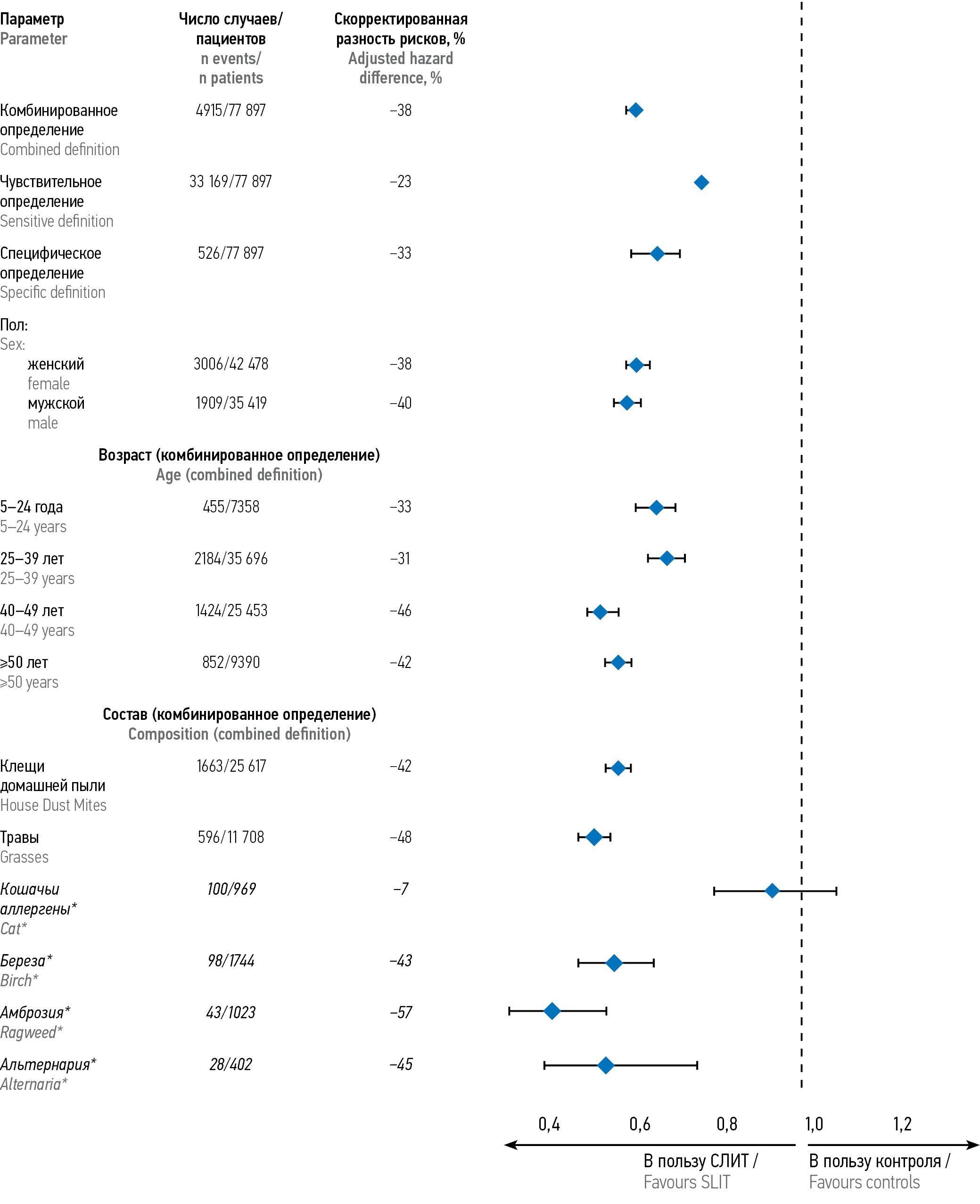 При рассмотрении данных пациентов без БА в анамнезе (n = 313 444), в том числе 77 897, получавших СЛИТ с использованием жидких форм препаратов, и 235 547 человек контрольной группы установлено, что применение СЛИТ связано со снижением частоты дебюта БА на одну треть по сравнению с симптоматическим лечением АР (ОР [95 % ДИ] для комбинированного определения — 0,62 [0, 60–0, 63]; чувствительного определения — 0,77 [0, 76–0, 78]; специфического определения — 0,67 [0, 61–0, 72]) (см. табл. 1, рис. 2). Взаимосвязи были стабильными для разных групп по возрасту, полу и аллергенам, при этом наблюдалось снижение на одну треть у пациентов в возрасте 5–24 лет (ОР [95 % ДИ] для комбинированного определения — 0,67 [0, 62–0, 71] — и на 40 % для клещей домашней пыли и трав (ОР [95 % ДИ] для комбинированного определения: 0,58 [0, 55–0, 61] и 0,52 [0, 49–0, 56] соответственно) (см. рис. 2). Данные по некоторым подгруппам не поддавались интерпретации из-за недостаточного числа случаев (менее 100).