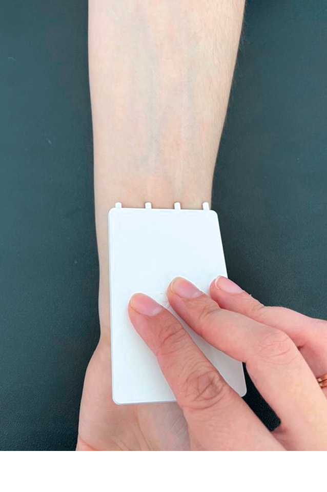 TempTest is a device with a U-shaped piezoelectric rash that generates a temperature range from 4°C to 44°C (Fig. 5). For testing, the patient places their forearm on the device so that the skin fits snugly against the piezoelectric rash. The exposure time is 5 min. The reaction is evaluated within 10 min, and the result is positive if an urticarial rash appears at the site of cold exposure. TempTest makes it possible to measure the critical temperature threshold with an accuracy of ±1°C [28] (Fig. 6).