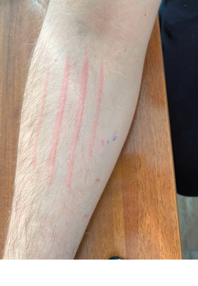 Fig. 3. Positive result of provocation testing in patient with symptimatic dermographism. (Photo from the archive of the Moscow City Reseach and Practical Center of Allergology and Immunology Ministry of Healthcare of Moscow).