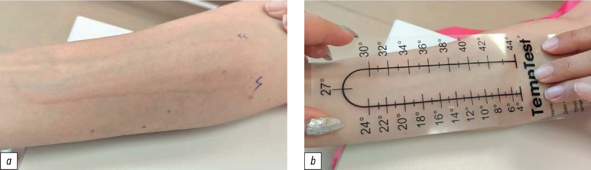 Fig. 6 (a, b). Positive result of provocation testing by TempTest device in patient with cold urticarial. (Photo from the archive of the Moscow City Reseach and Practical Center of Allergology and Immunology Ministry of Healthcare of Moscow).