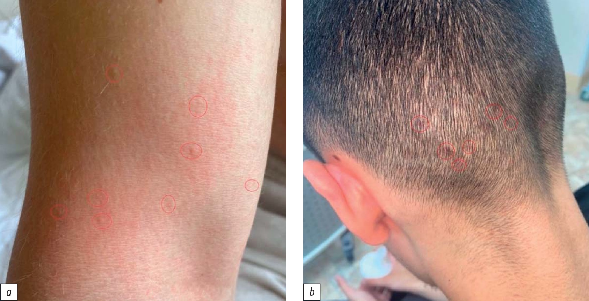 Fig. 8 (a, b). Positive result of provocation testing in patient with cholinergic urticarial. (Photo from the archive of the Moscow City Reseach and Practical Center of Allergology and Immunology Ministry of Healthcare of Moscow).