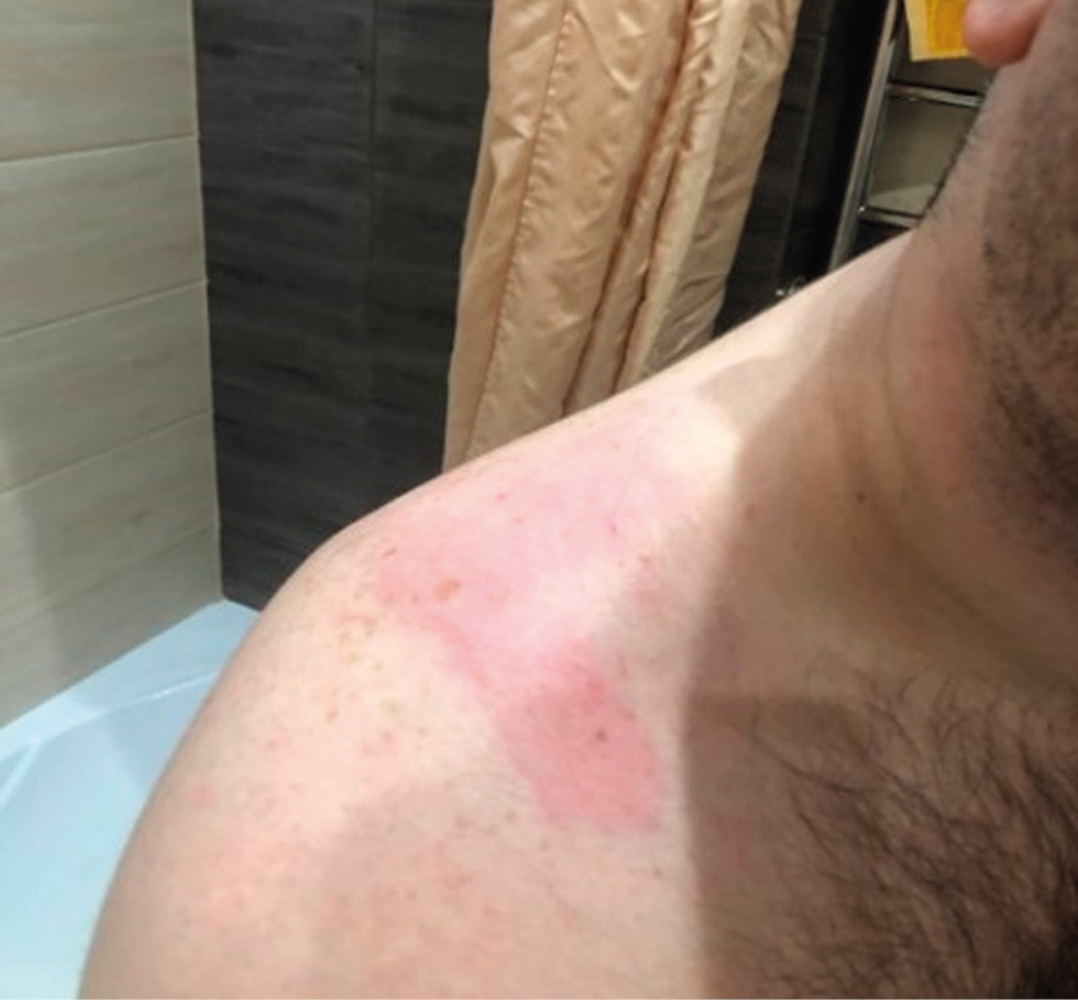 Fig. 9. Positive result of provocation testing in patient with delayed pressure urticaria (test with sand bag). (Photo from the archive of the Moscow City Reseach and Practical Center of Allergology and Immunology Ministry of Healthcare of Moscow).