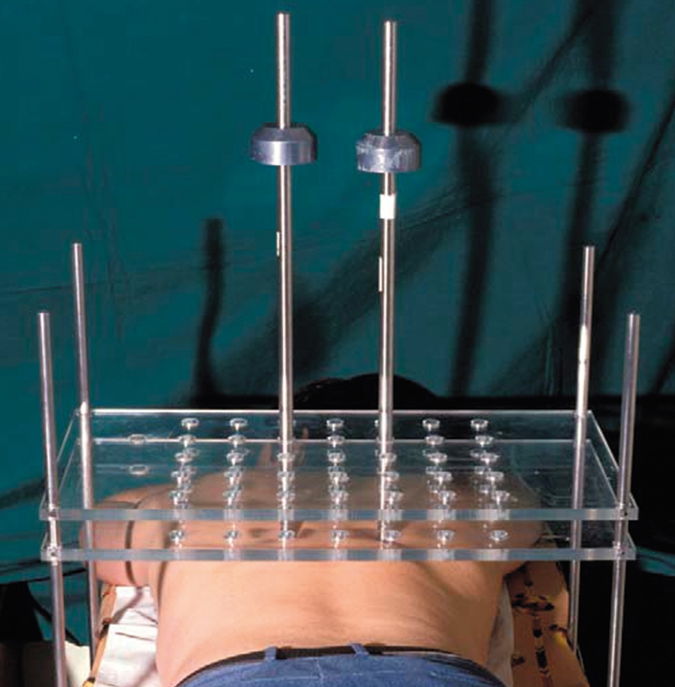 A bag (strap width 3 cm, weight 7 kg) or a weighted strap (strap width 1.5 cm, weight 2.5 kg or width 6, 5 cm, weight 5 kg) is hung at the test site (shoulder, upper back, thigh, or forearm) for 15 min. The result is evaluated within 24 h. A reaction is positive if wheals or edema occur at the site of pressure [84–86] (Fig. 9). Another diagnostic method involves the vertical placing of metal cylinders of various cross-sectional areas and weights on the skin of the back, thigh, or forearm (Fig. 10, [82]). The mass and cross-sectional area of the cylinders vary among researchers [82–86]. Currently, no tests are standardized for the diagnosis of delayed pressure urticaria, and this method is not registered in the Russian Federation.