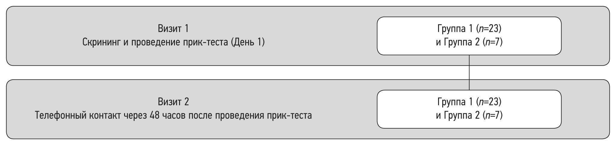 - Визит 2: период последующего наблюдения (телефонный контакт через 48 ч после проведения прик-теста).