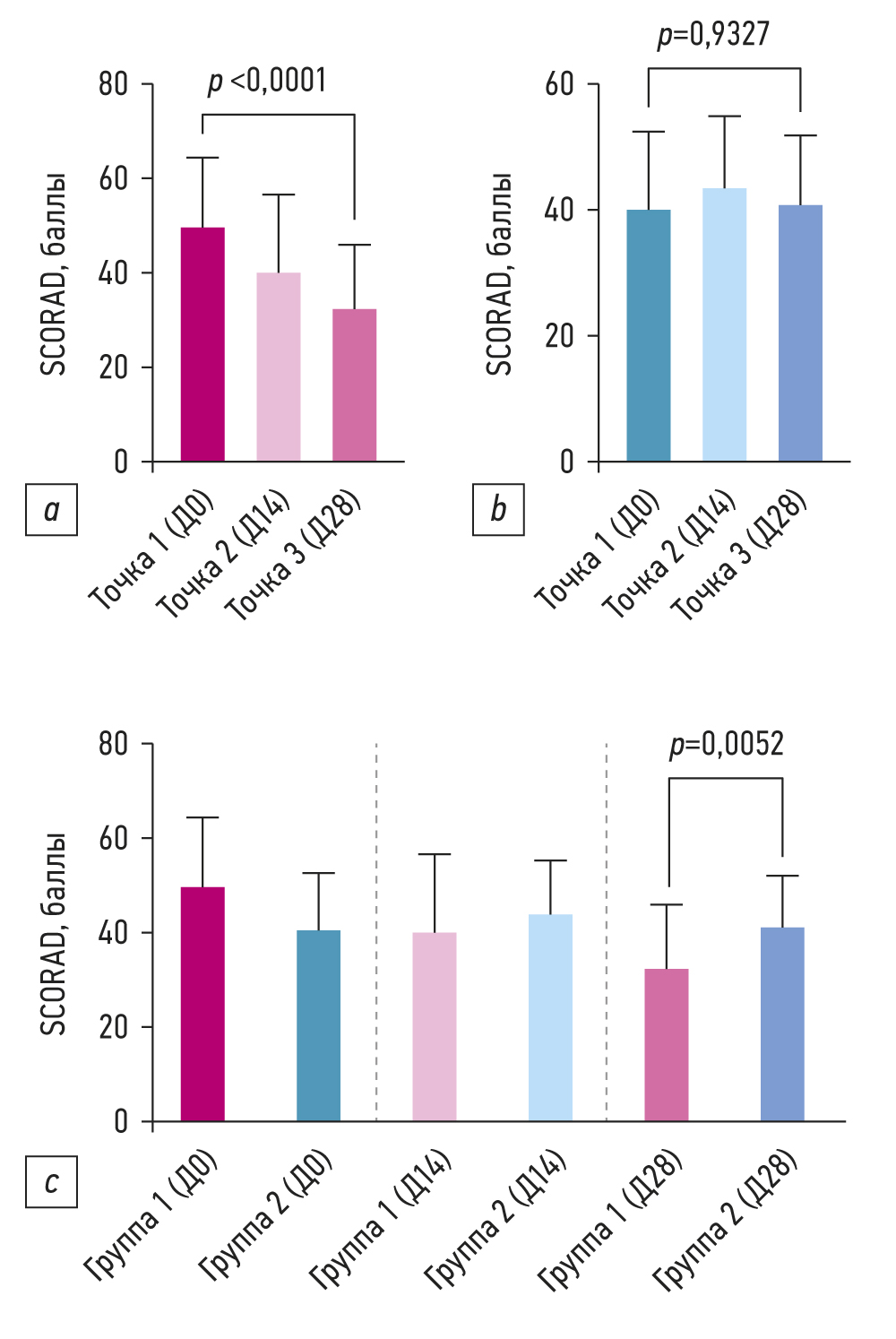Fig. 1. SCORAD dynamics at three timepoints: а ― in patients of Group 1; b ― in patients of Group 2; с ― comparison of indicators in groups 1 and 2. Д0, Д14, Д28 ― study days 0; 14th and 28th.