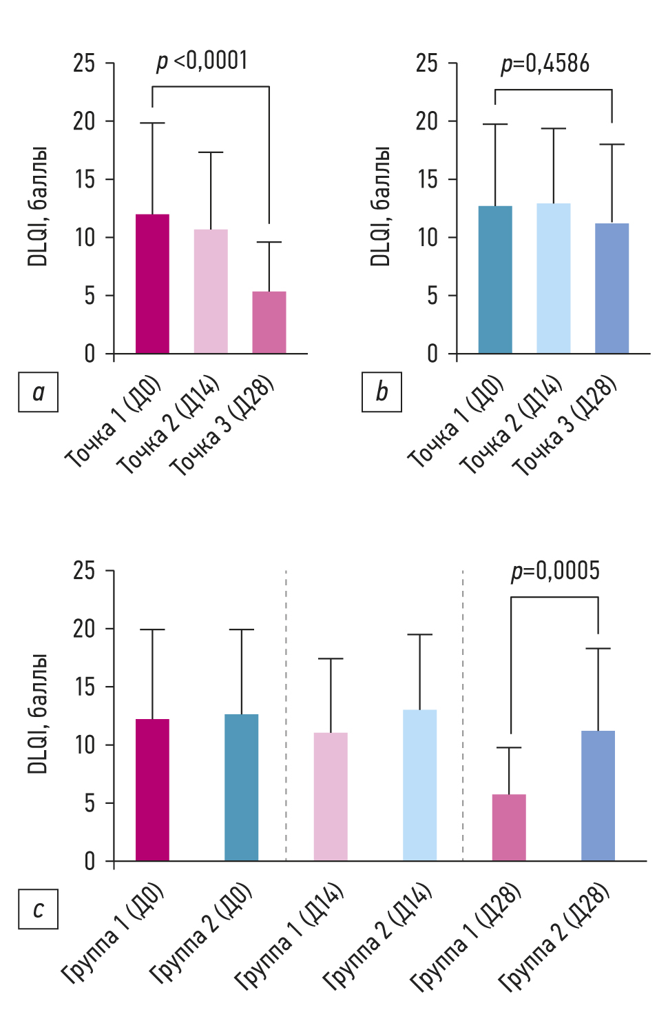 Качество жизни пациентов оценивали с использованием дерматологического индекса качества жизни (DLQI). При оценке динамики показателя внутри каждой группы отмечено достоверное снижение индекса DLQI в Группе 1 к 28-му дню, тогда как в Группе 2 достоверных изменений индекса DLQI не наблюдалось. При сравнении показателей данного индекса между группами к 14-му дню исследования достоверных различий между группами не отмечалось (p=0,1704), однако к 28-му дню индекс DLQI в Группе 1 был достоверно ниже, чем в Группе 2 (p=0,0005). На рис. 2 представлены динамика показателей индекса DLQI в основной и контрольной группах и сравнение показателей индекса DLQI в трёх точках исследования.