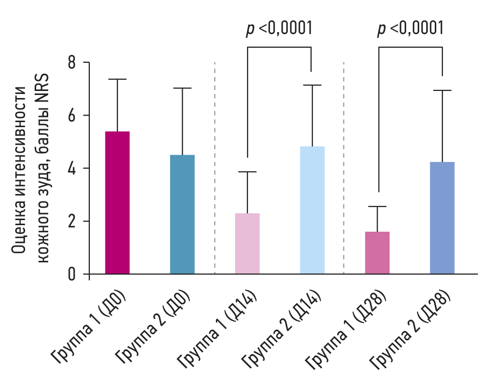 Оценку интенсивности кожного зуда проводили с помощью цифровой рейтинговой шкалы NRS. При сравнении значений данного показателя внутри каждой группы отмечалось его достоверное снижение уже к 14-му дню исследования в Группе 1 (p <0,0001), в то время как в Группе 2 данный показатель оставался без значимой динамики даже к 28-му дню исследования. При сравнении значений данного показателя между двумя группами интенсивность зуда в Группе 1 к 14-му и 28-му дню исследования была достоверно ниже, чем в Группе 2 (p <0,0001). На рис. 3 представлено сравнение показателей интенсивности кожного зуда в баллах NRS в трёх точках исследования в группах 1 и 2.