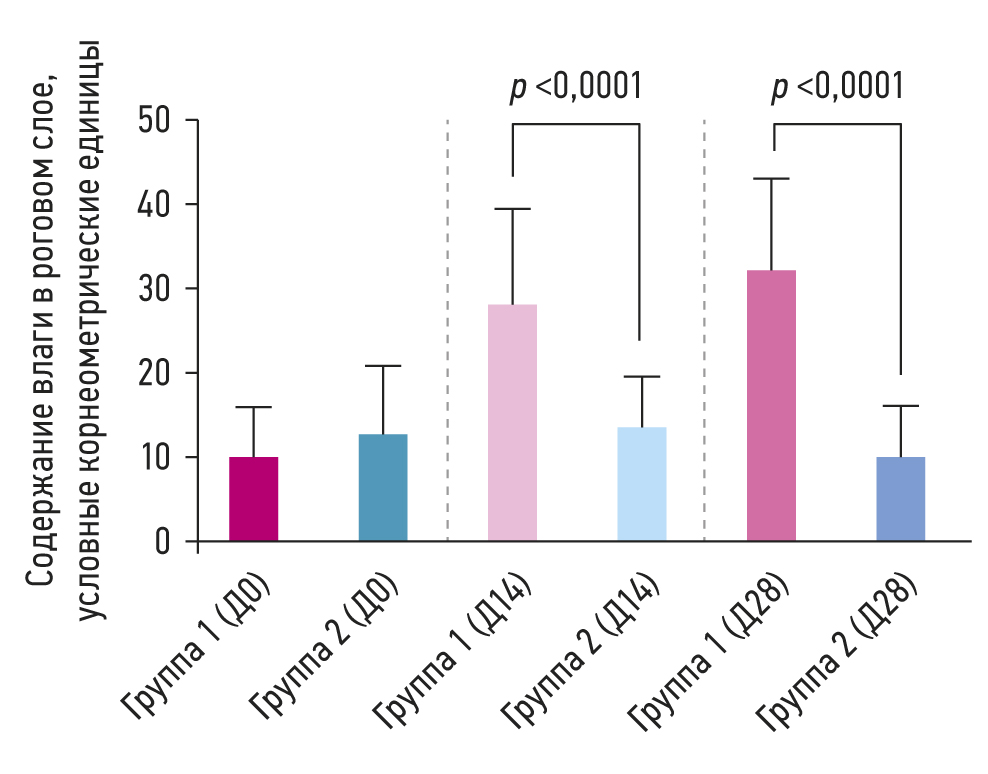 Оценку степени увлажнённости кожного покрова (содержание влаги в роговом слое) проводили с помощью корнеометрии. Результаты были представлены в условных корнеометрических единицах. При сравнении динамики данного показателя внутри каждой группы достоверное увеличение содержания влаги в роговом слое к 14-му и 28-му дню исследования отмечалось в Группе 1 (p <0,0001), в Группе 2 достоверного изменения данного показателя не отмечалось. При сравнении показателя корнеометрии между двумя группами данный показатель был достоверно выше к 14-му и 28-му дню исследования в Группе 1. На рис. 4 представлено сравнение показателей содержания влаги в роговом слое кожи в трёх точках исследования.