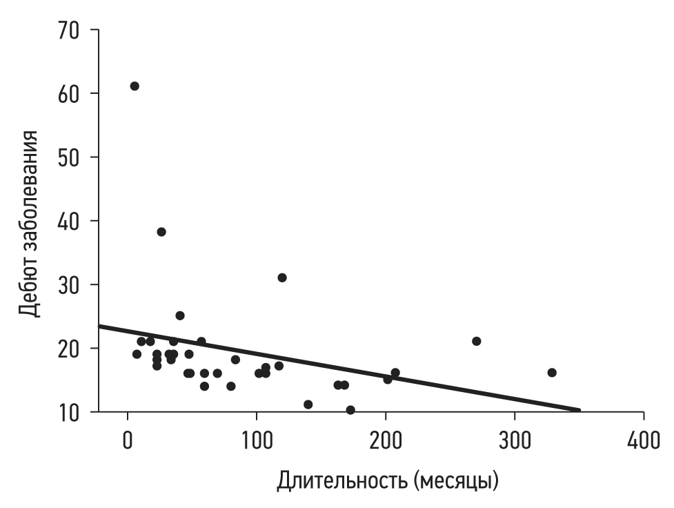Рис. 1. Корреляция между возрастом дебюта и продолжительностью холинергической крапивницы.