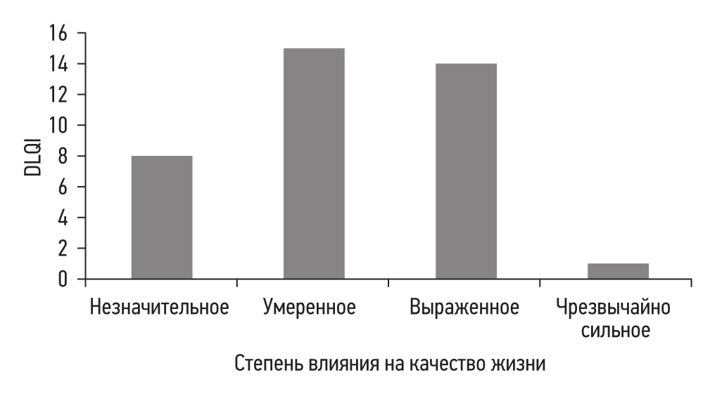 Степень влияния симптомов крапивницы на активность и качество жизни пациентов оценивали посредством интерпретации результатов валидизированного опросника DLQI: