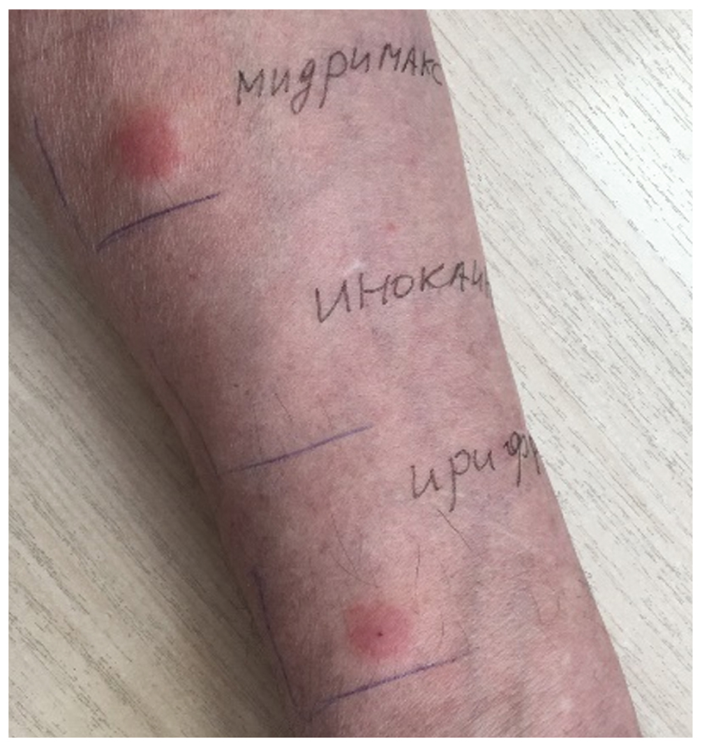 Данные объективного обследования свидетельствовали об отсутствии противопоказаний для аллергодиагностки с ЛС: симптомы острого блефароконъюнктивита отсутствовали, признаков бронхиальной обструкции не было, сатурация 98%, артериальное давление и частота сердечных сокращений в норме. В общем и биохимическом анализах крови и анализе мочи ― без отклонений от нормы. При электрокардиографии патологии, являющейся препятствием для лекарственных проб, не обнаружено. Препаратов, которые могли бы повлиять на результаты кожных тестов, не принимал.