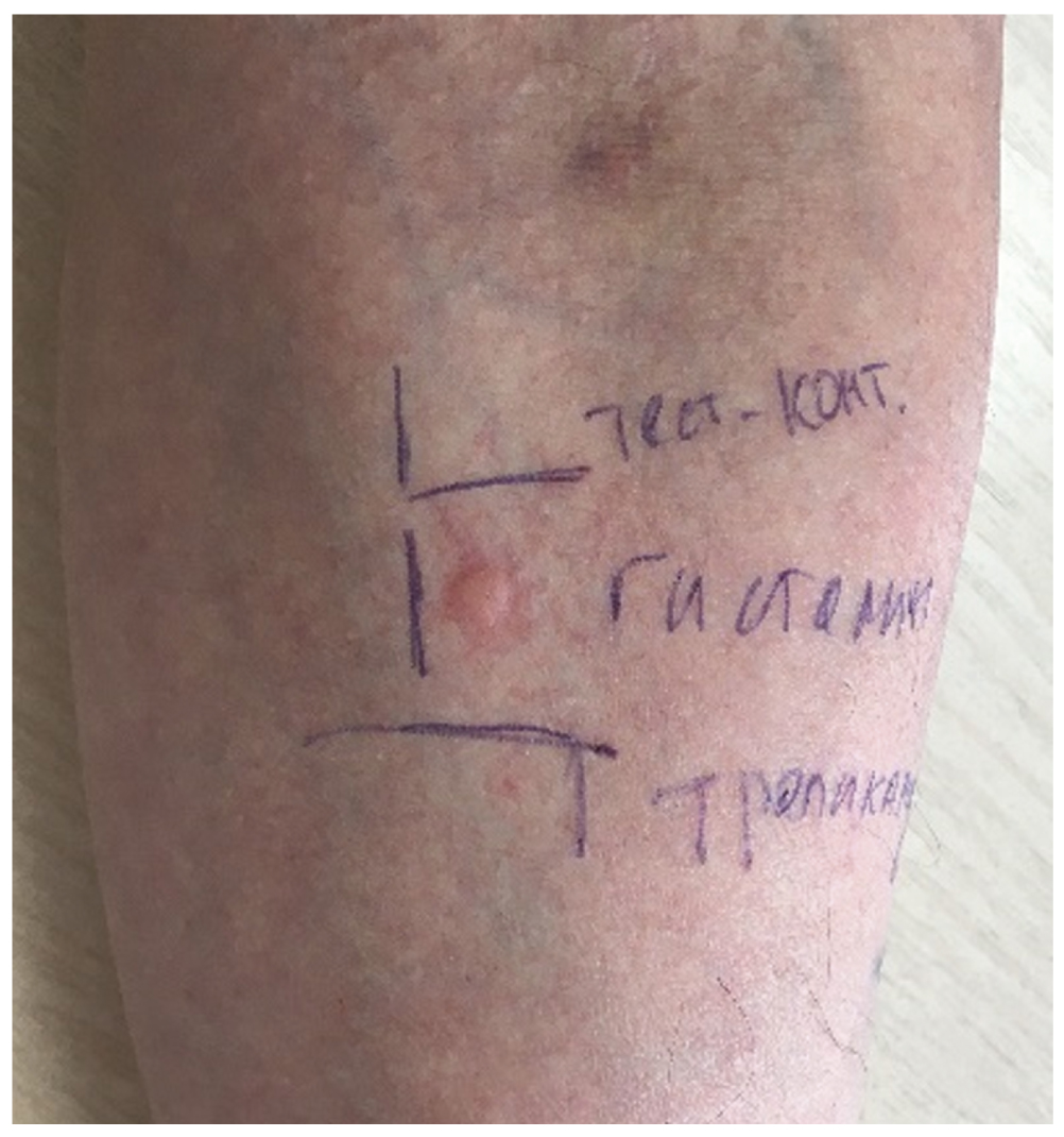 После получения от пациента информированного добровольного согласия проведено кожное тестирование с ЛС в соответствии с современными рекомендациями [8–10].